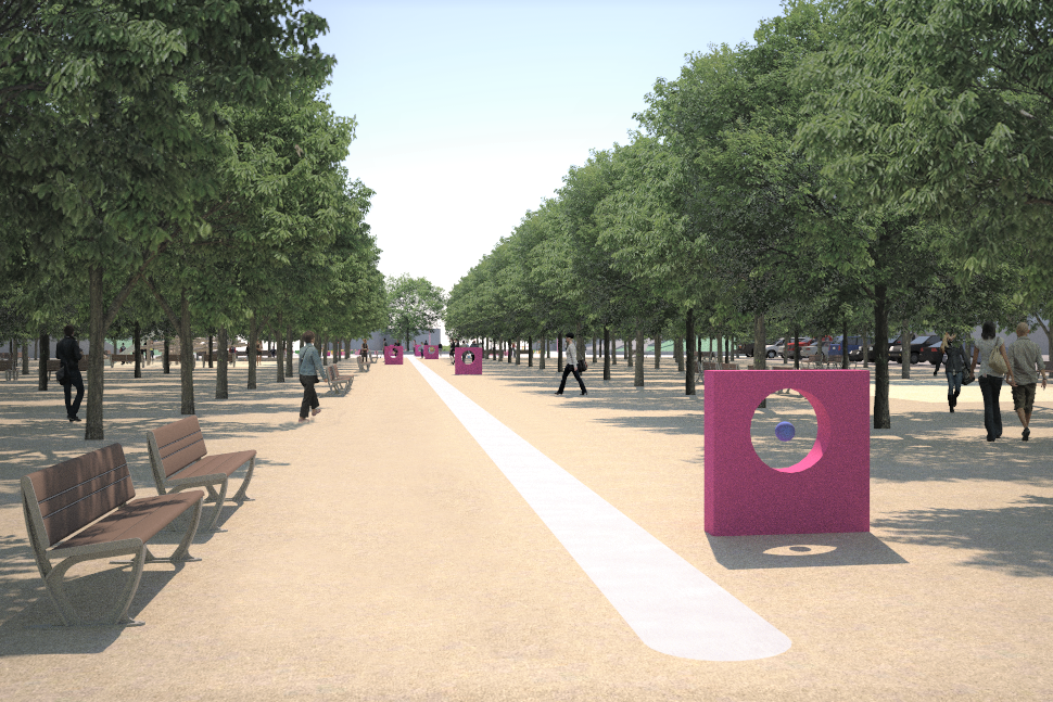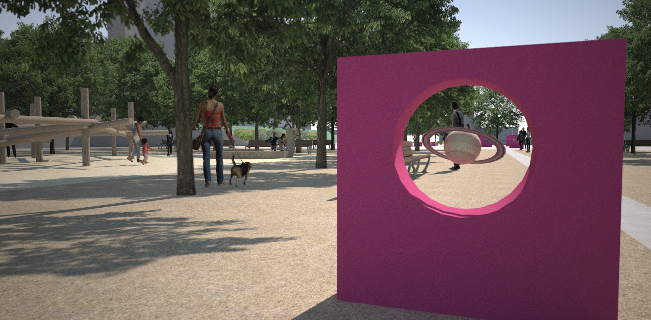 Městská část nás oslovila s přáním rozšířit koncept i o přilehlou travnatou plochu. Zde je výsledek, les vedle stanice metra, stromy tvoří pravidelný rastr tzv. bosket, který je v některých částech vynechán pro linii sluneční soustavy, dětské hřiště apod.