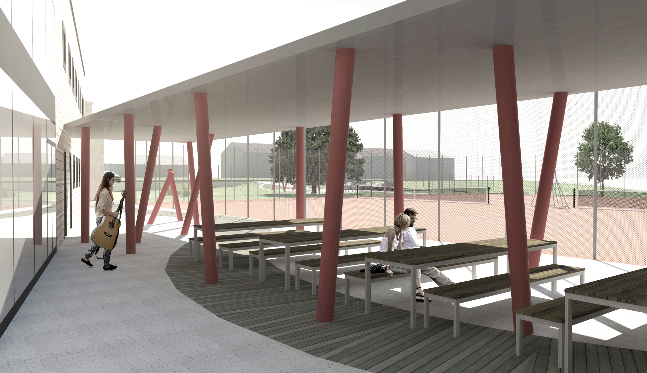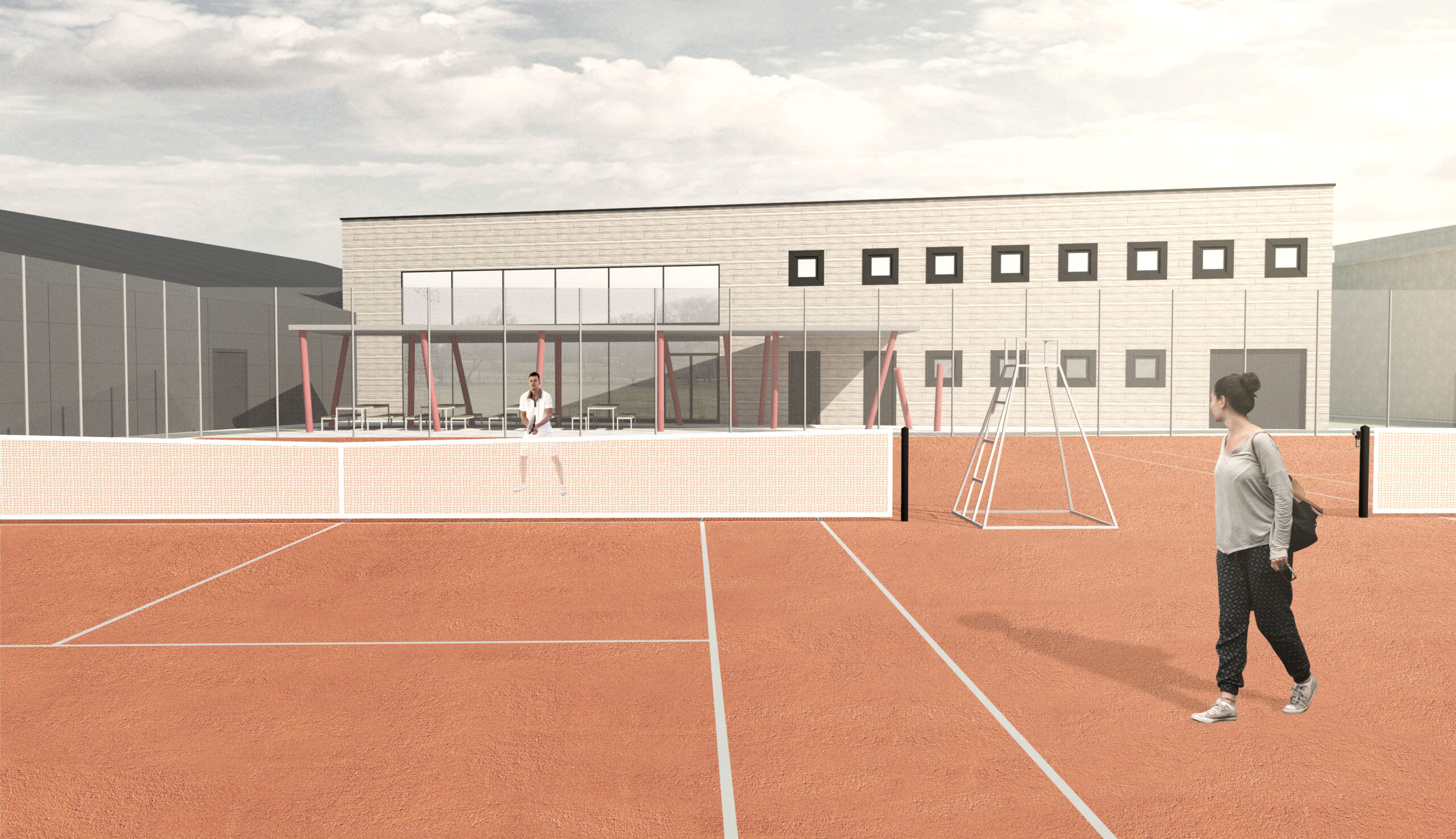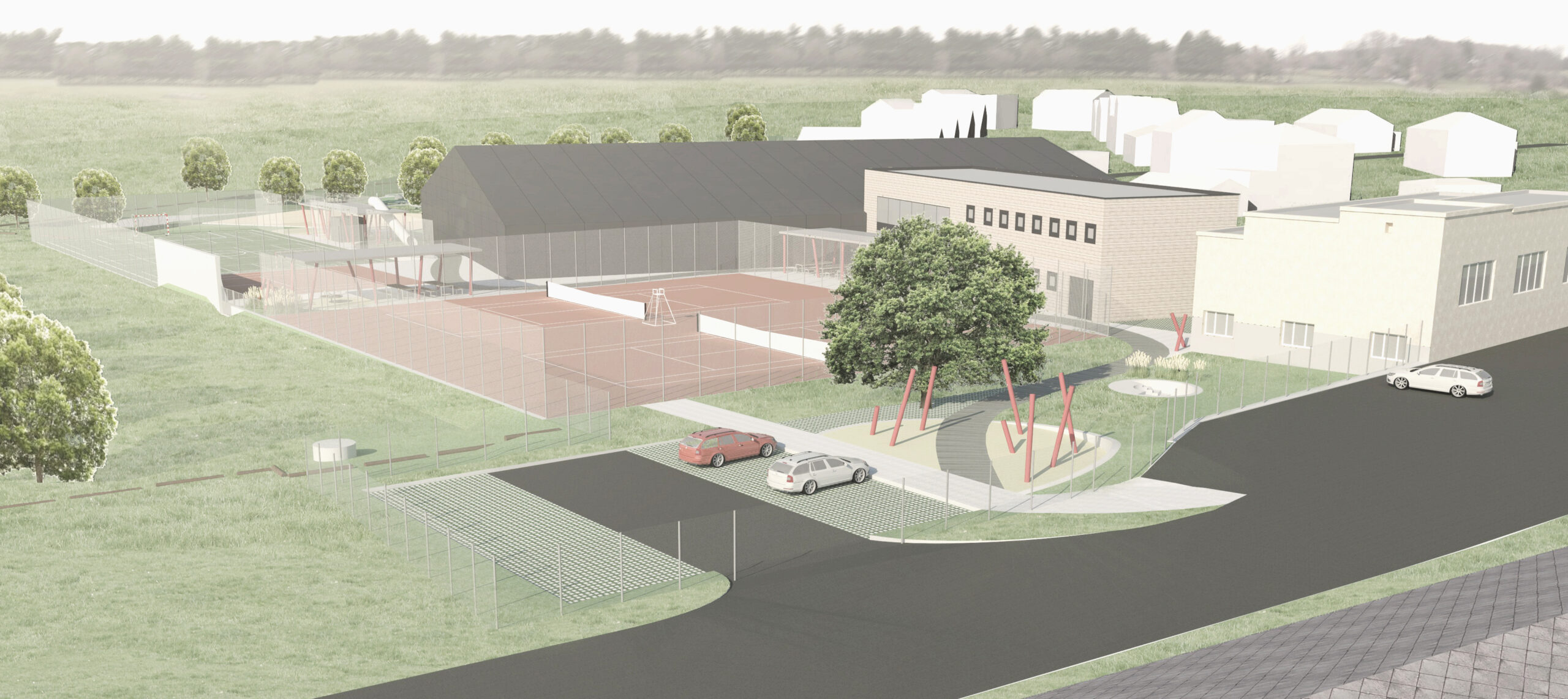 - Jedná se o radikální rozšíření stávajícího areálu u Sokolovny v Bukovicích o novou tenisovou halu a další venkovní sportoviště. Návrh řešení byl pro nás takovou hrou, jak nejlépe na nepravidelný pozemek, která je pro výstavbu k dispozici, poskládat maximum regulérních, nebo co největších sportovišť a přitom dodržet podmínky územního plánu a maximálně potlačit v pohledech z okolí areálu velký objem tenisové haly obsahující 3 kurty, tak abychom získali ve finále souhlas se stavbou od CHKO Broumovsko. Souhlas CHKO již máme, tak teď je potřeba získat poslední doklady pro stavební povolení, aby se mohla rozjet výstavba.