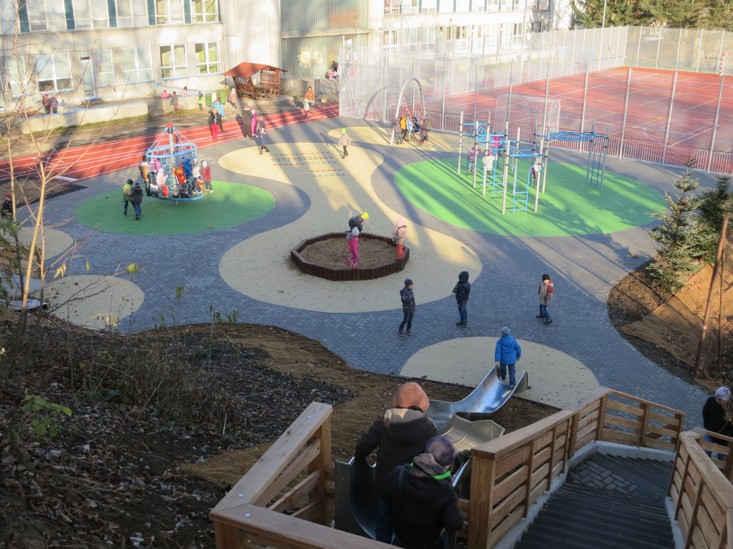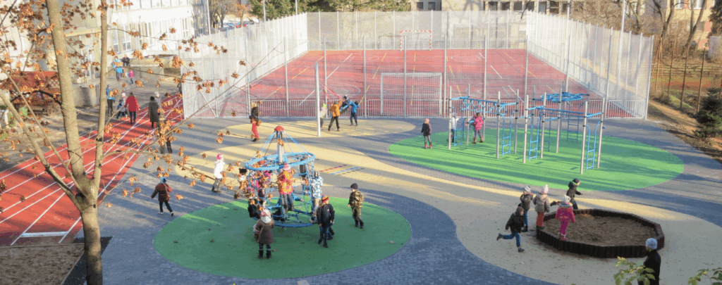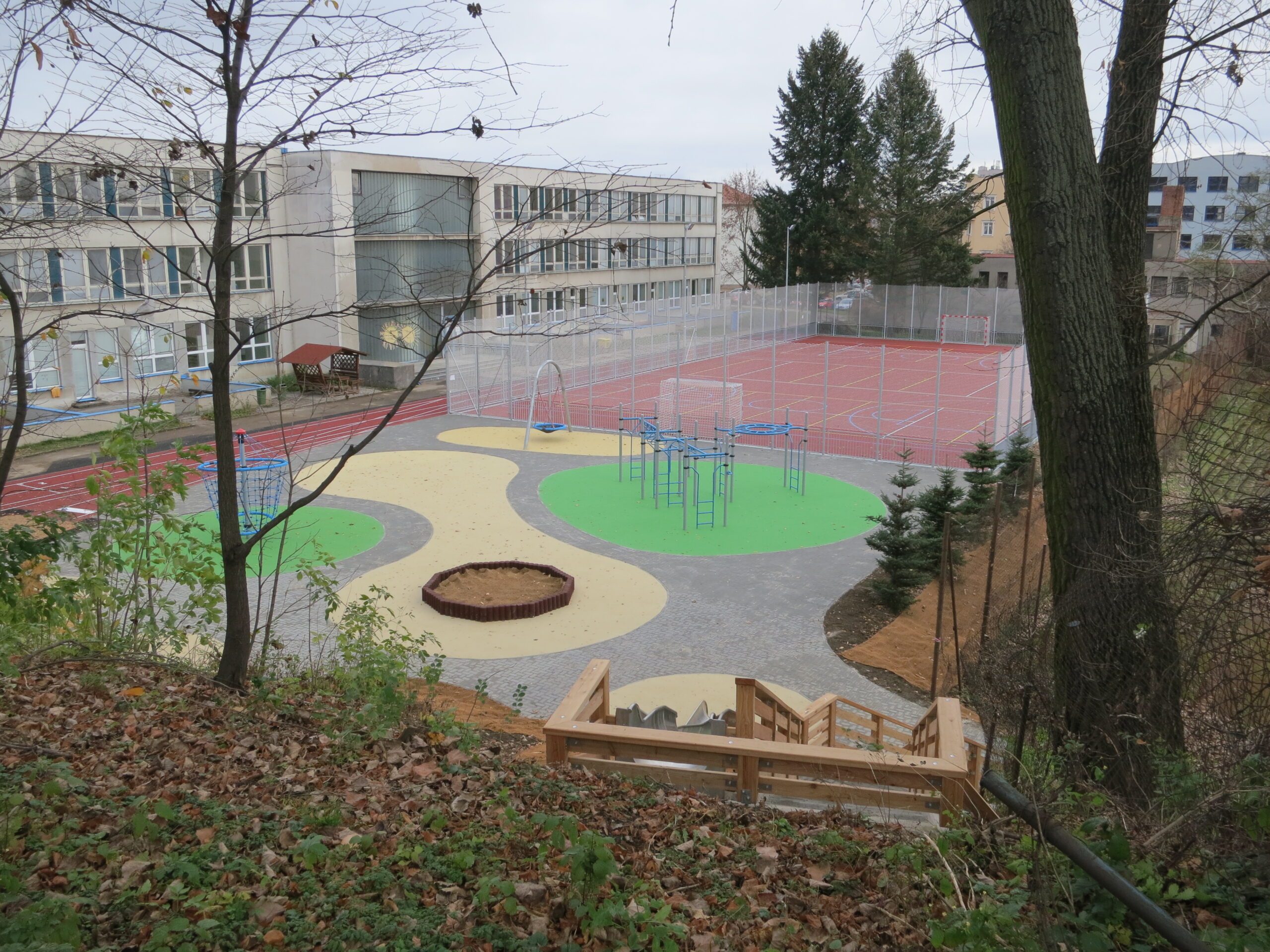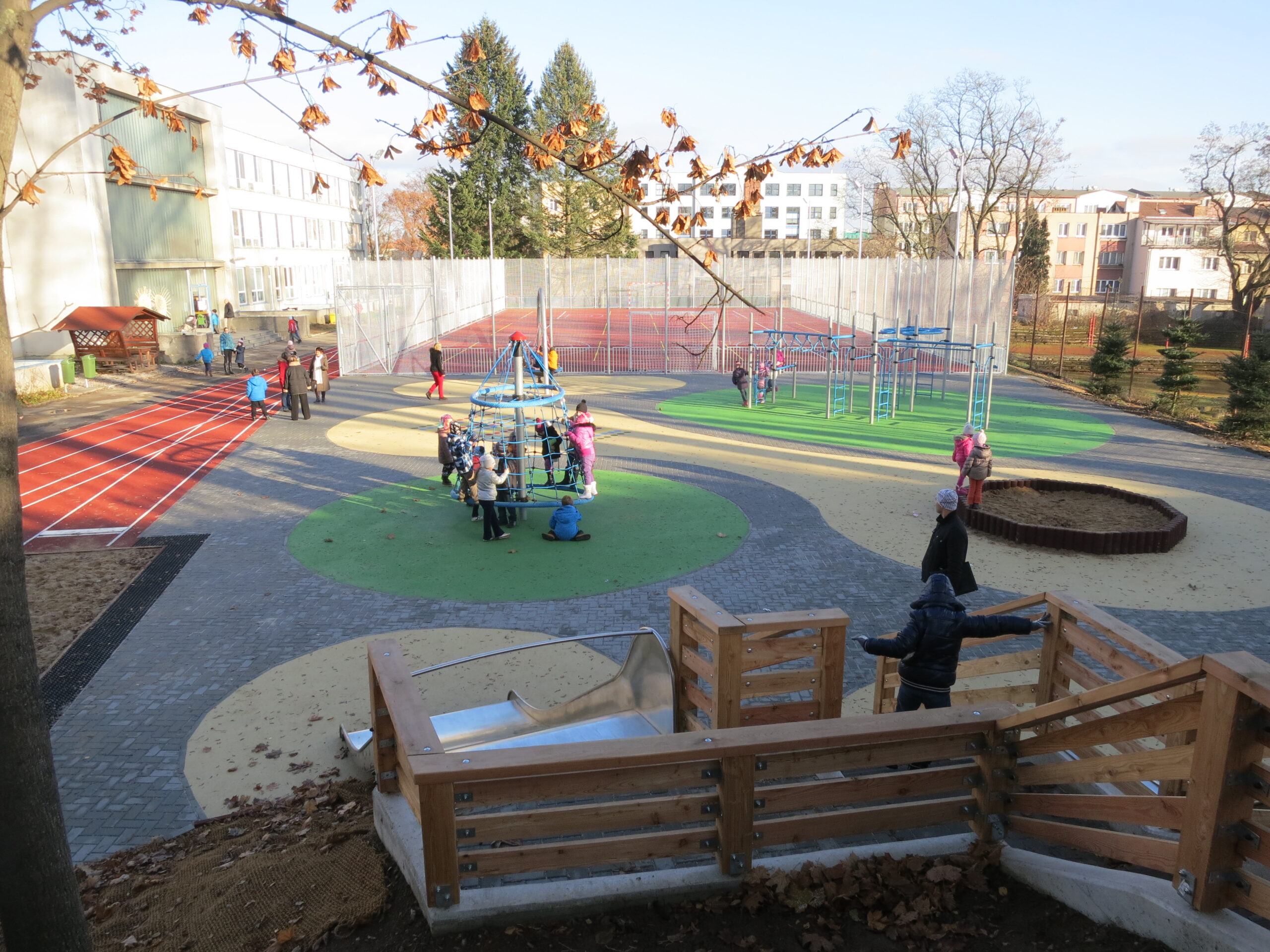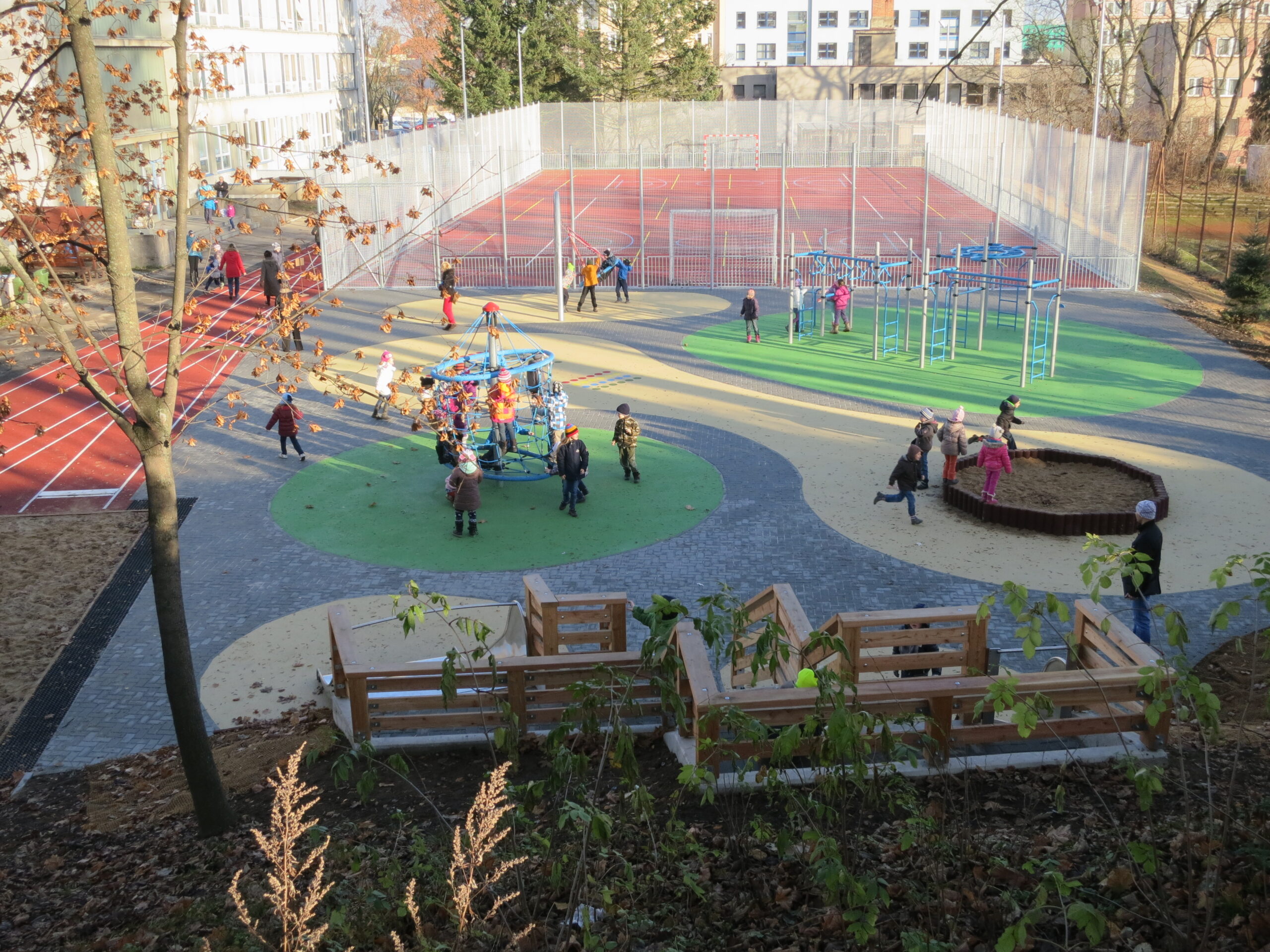 Dožívající školní areál s běžeckou rovinkou, skokem do dálky a dvojicí volejbalových hřišť 12x22m byl přestavěn na multifunkční areál zahrnující velké víceúčelové hřiště pro míčové sporty a dětské hřiště s prvky podporující kondiční připravenost dětí. Zároveň se podařilo udržet atletické funkce areálu pro výuku tělesné výchovy v podobě běžecké rovinky pro běhy na 60m a sektoru pro skok daleký.
